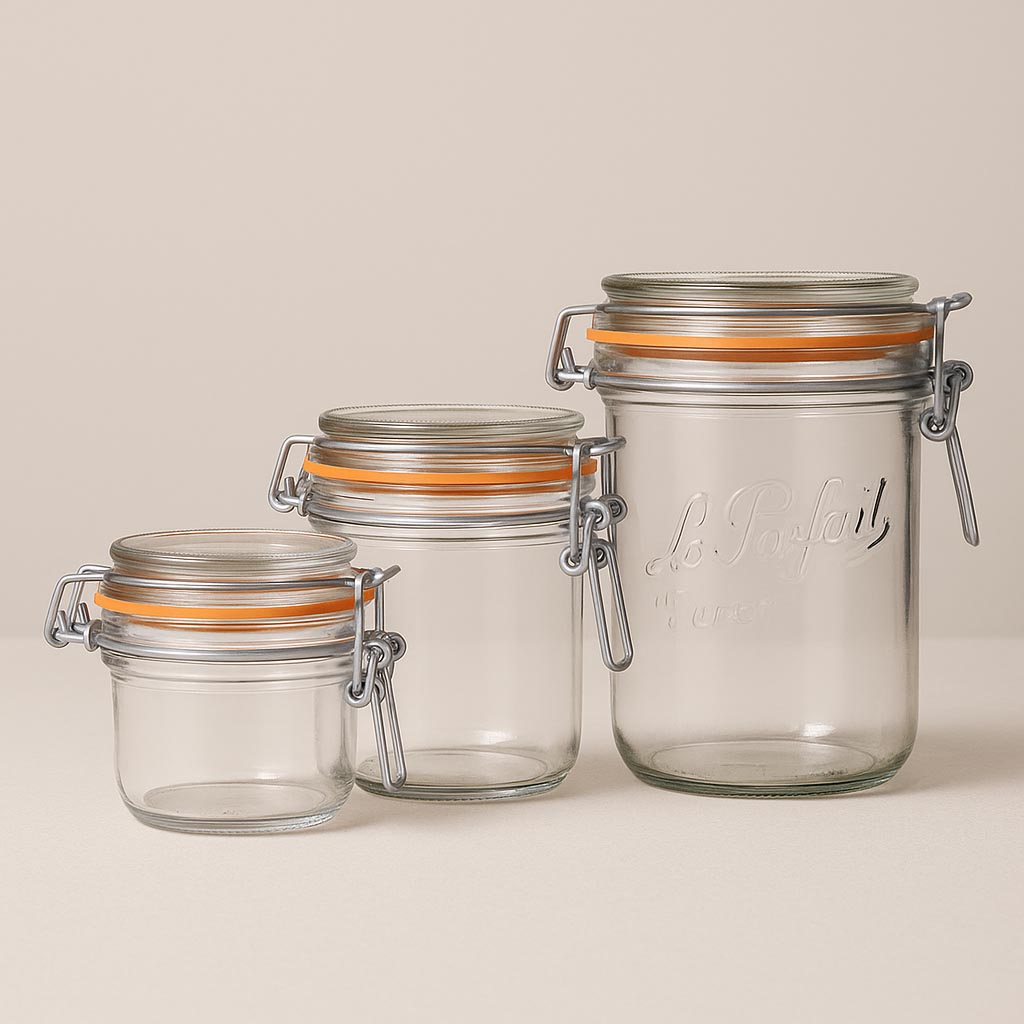Le Parfaitin "Super Terrine" -sarja edustaa aitoa ranskalaista käsityötaitoa ja tarjoaa korkealaatuisen ratkaisun elintarvikkeiden säilytykseen ja esillepanoon. Tämä klassinen metallilukkokansi lasipurkki, jossa on "Le Parfait Super" -reliefi, on suunniteltu erityisesti kumoamislasiksi, mikä mahdollistaa kakkujen, pikkuleipien ja muiden jälkiruokien vaivattoman irrottamisen. Lisäksi se sopii erinomaisesti hillojen, makkaran ja lihasäilykkeiden sekä monien hienojen levitteiden säilytykseen. Tilavuudeltaan 125–1000 ml "Super Terrine" tarjoaa monipuolisia käyttötarkoituksia. Mukana tuleva lasikansi ja tunnusomainen oranssinvärinen kumitiiviste takaavat turvallisen ja ilmatiiviin sulkemisen.