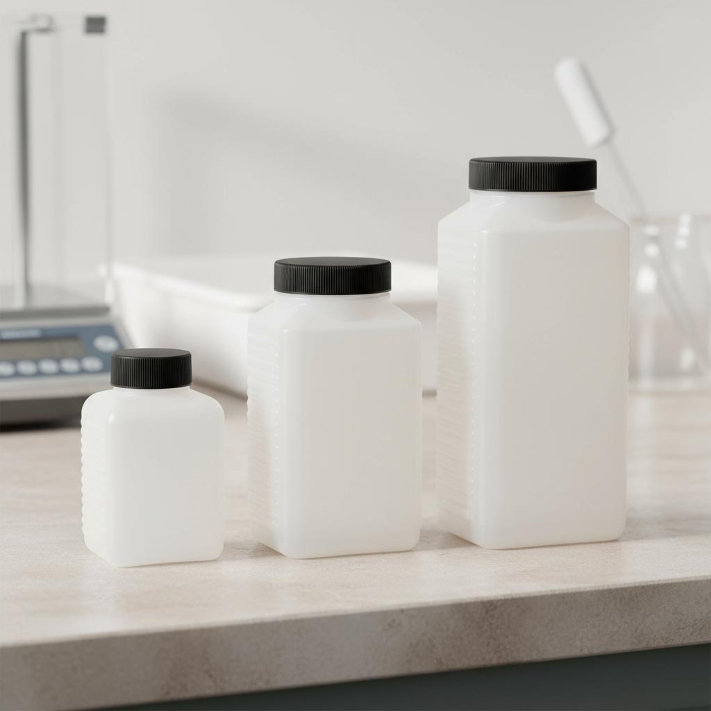 Pullot ja purkit 250 ml leveäkaulainen pullo, suorakaide, HDPE-muovi, luonnonväri, suuaukko: DIN 40 EPE