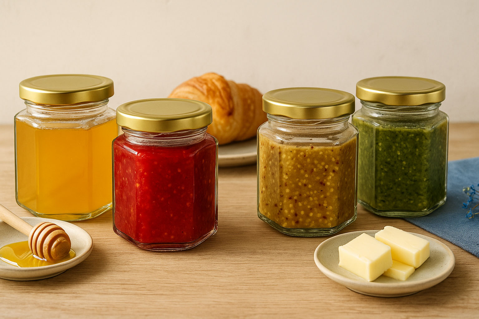 Tyylikkäät kuusikulmaiset lasit yhdistävät esteettisen muotoilun käytännölliseen toimivuuteen. Niiden kuusikulmainen pohja antaa niille erityisen ulkonäön ja mahdollistaa samalla tilaa säästävän säilytyksen. Valmistettu Euroopassa, ne vakuuttavat korkealaatuisella viimeistelyllään ja monipuolisuudellaan. Olipa kyse aromaattisista tahnoista, mausteisista pestokastikkeista, hedelmäisistä hillosta tai hienostuneesta hunajasta – nämä lasit tarjoavat täydellisen pakkauksen erilaisille erikoistuotteille.