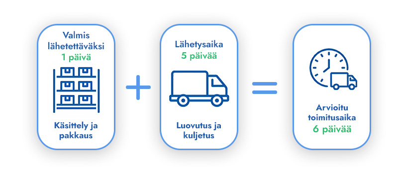 ”Valmis lähetettäväksi” tarkoittaa aikaa, jonka yrityksemme tarvitsee tilauksesi käsittelyyn ja lähettämiseen valmistelemiseen. Se alkaa tilauksesi vastaanottamisesta ja päättyy, kun pakettisi on valmis kuljetusyrityksen noudettavaksi.