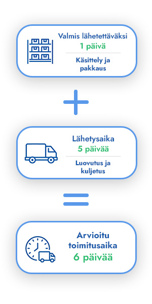 *Koskee tilauksia, jotka on tehty klo 12:00 mennessä (ma-to) ja maksettu välittömällä maksutavalla. Suurkaupunkialueilla toimitusaika on 1 arkipäivä. Muille alueille toimitus voi kestää jopa 2 arkipäivää kauemmin.